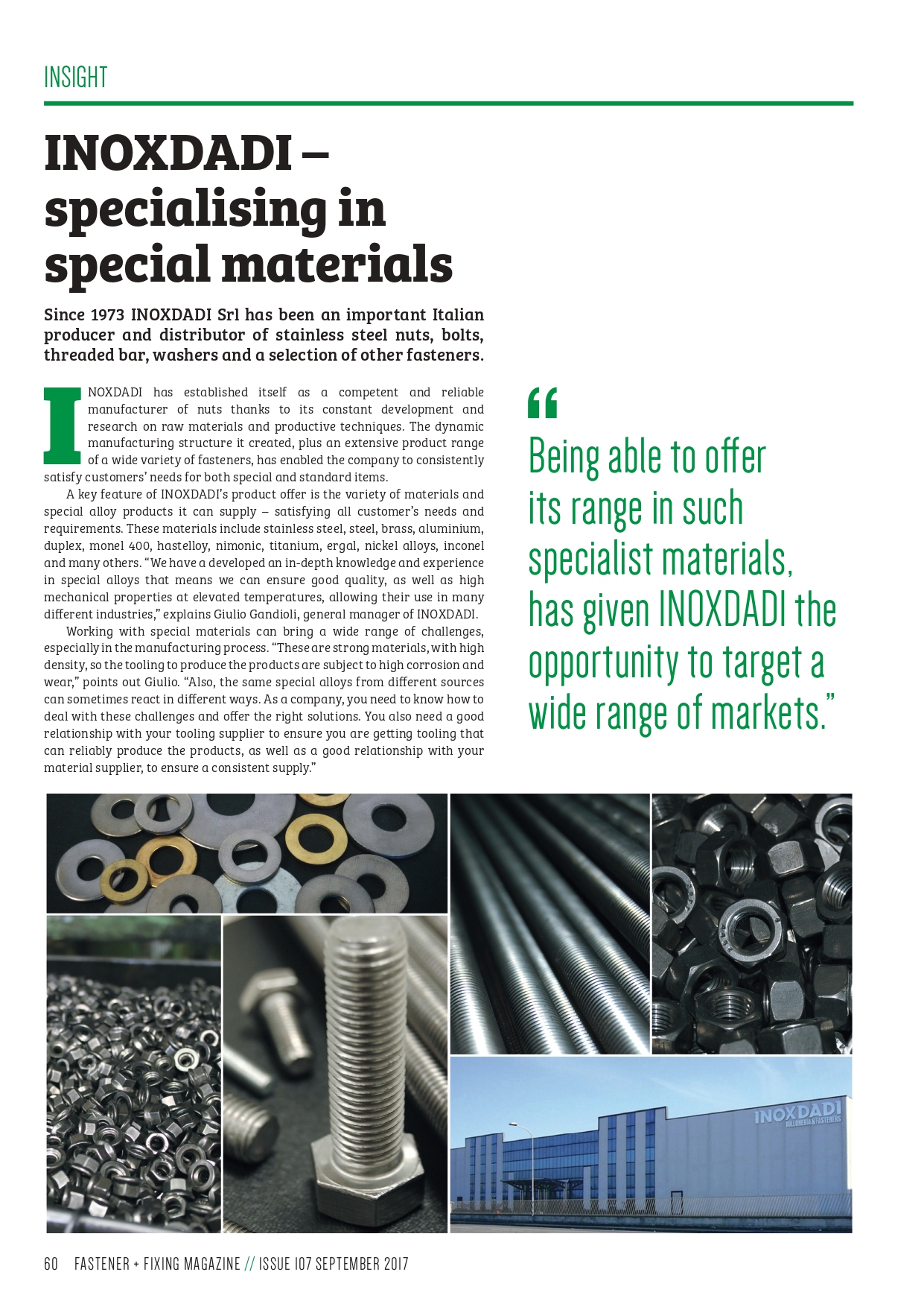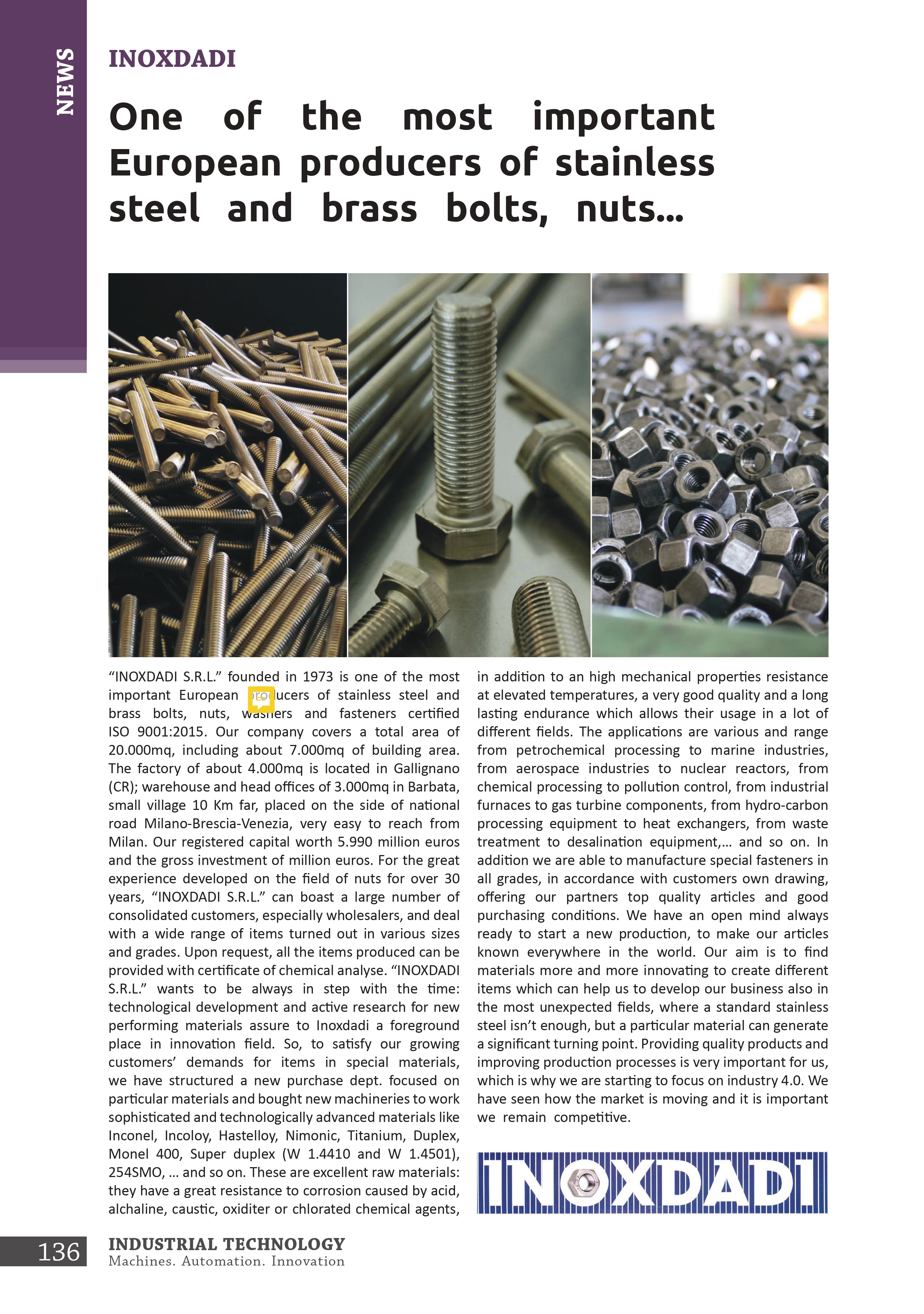 InoxDadi S.r.l. è un'azienda leader nella produzione e commercializzazione di bulloneria e fasteners di alta qualità, realizzati in una vasta gamma di leghe e materiali. Fondata nel 1973, ha costruito la propria reputazione su innovazione, qualità e capacità di rispondere alle esigenze specifiche del cliente.